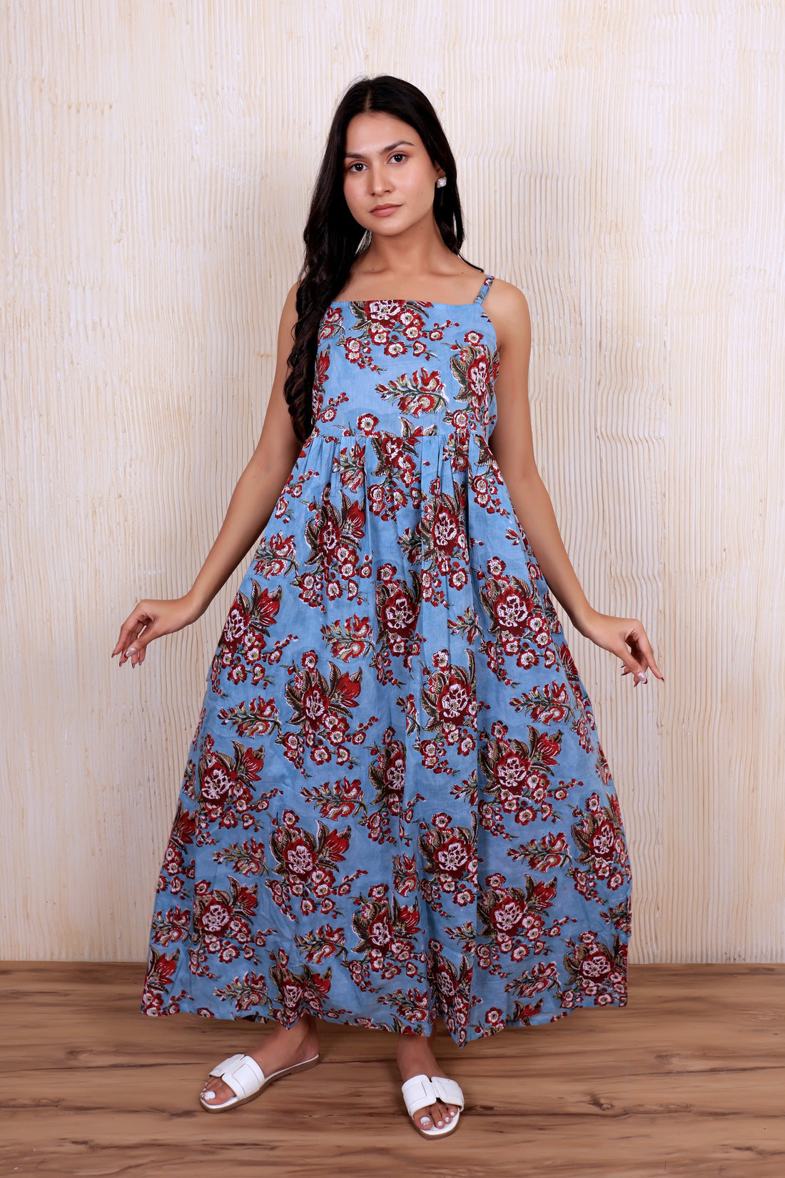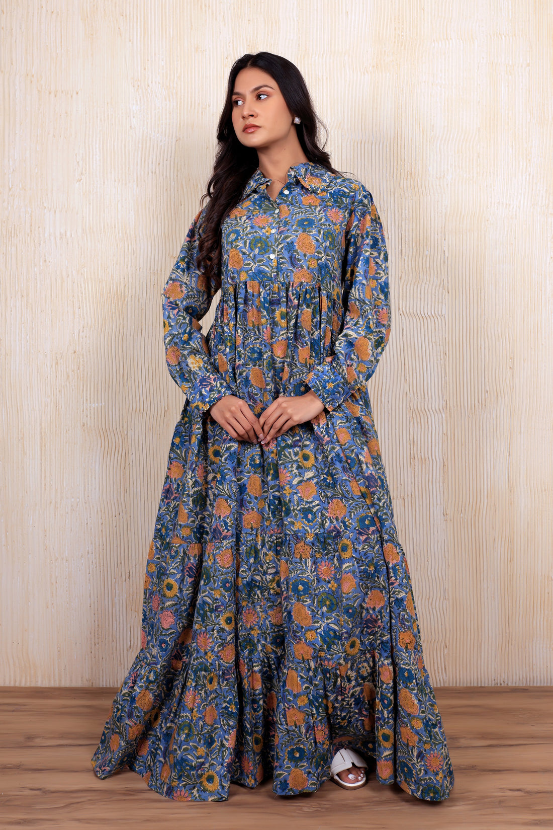 Block Print Floral Cotton Long Bohemian Kaftan Dress