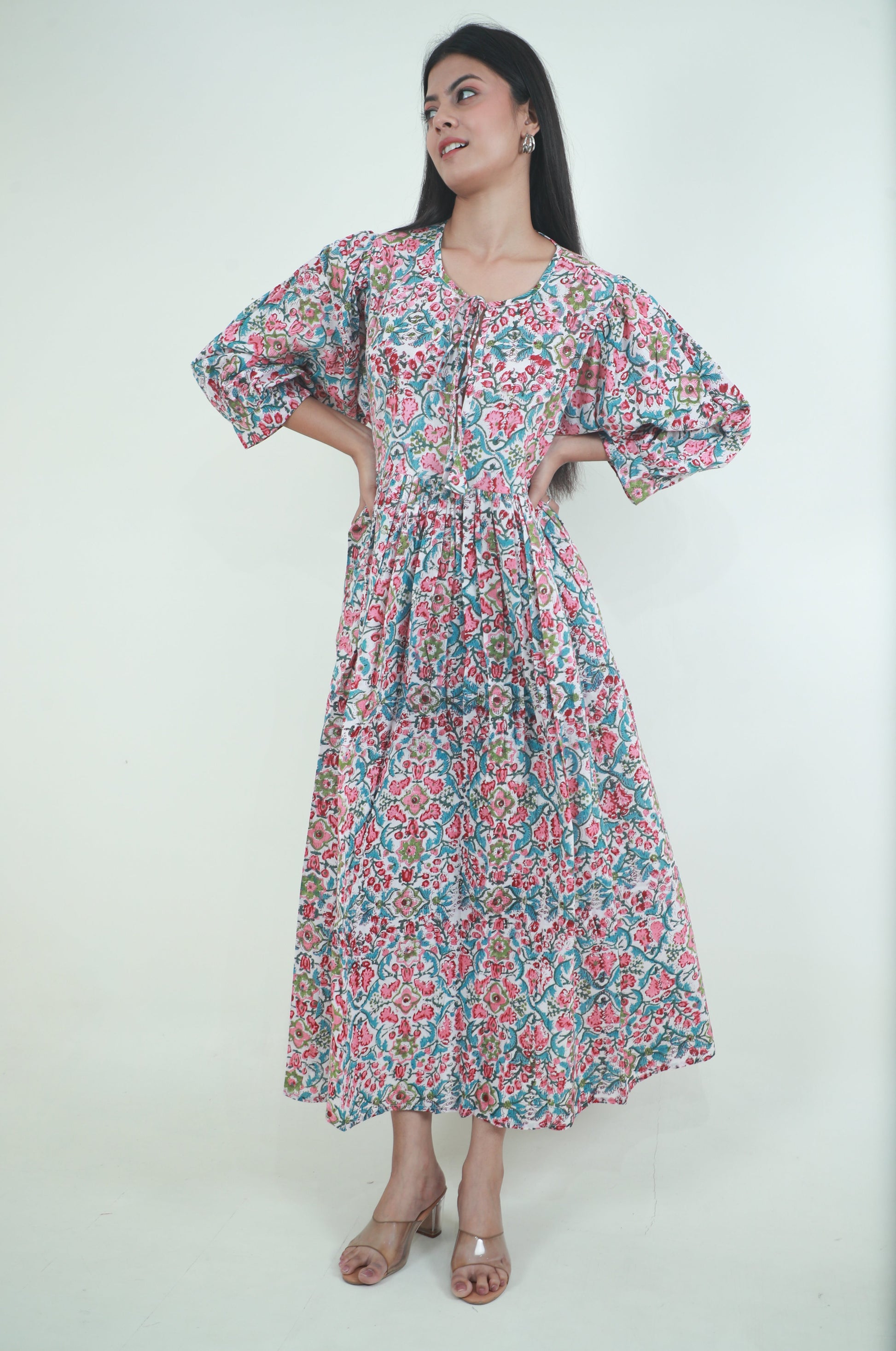 Add a touch of grace and sophistication to your collection with the Blando Cotton Block Print Long Dress. This versatile piece is designed to make you look and feel fabulous, no matter the occasion.