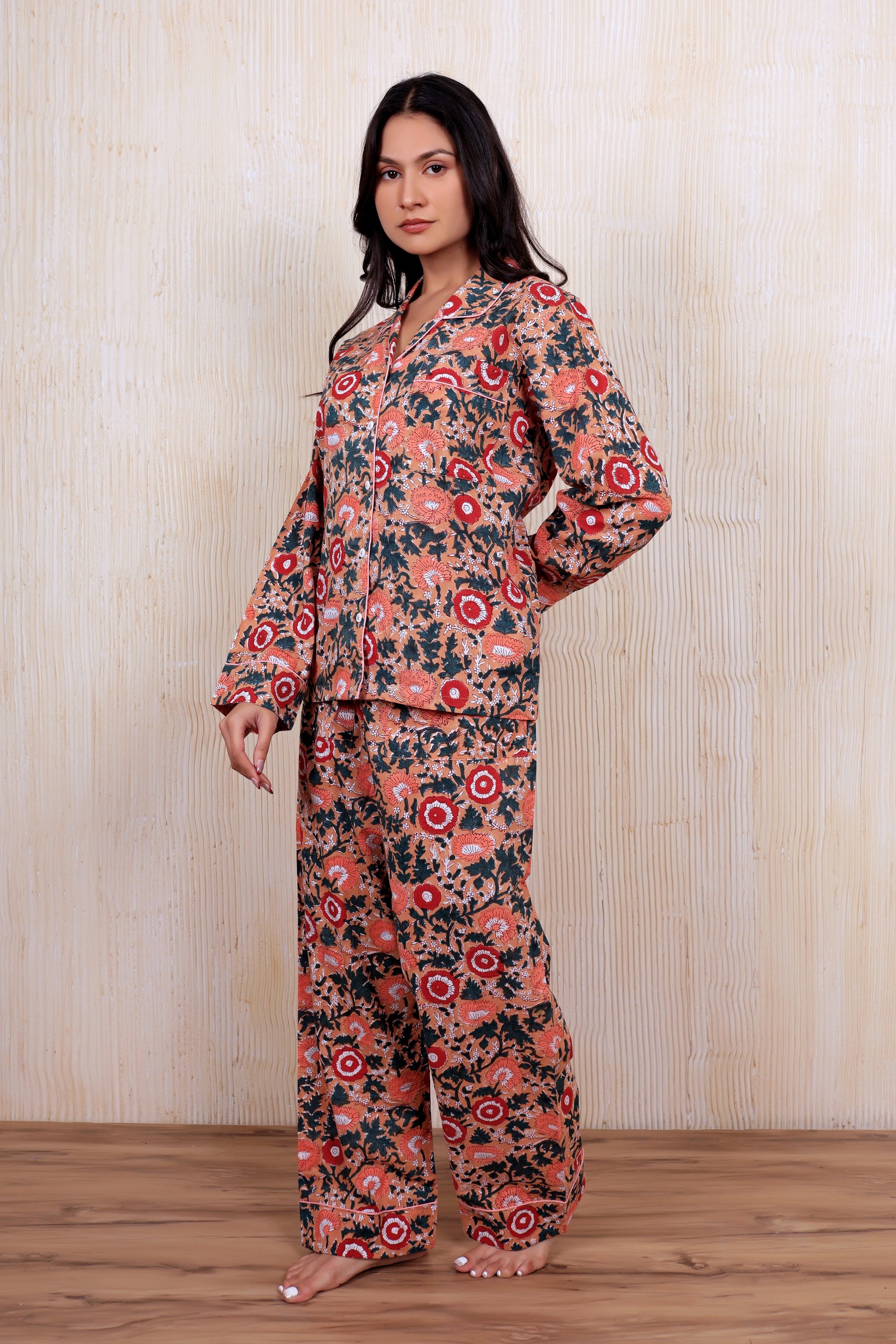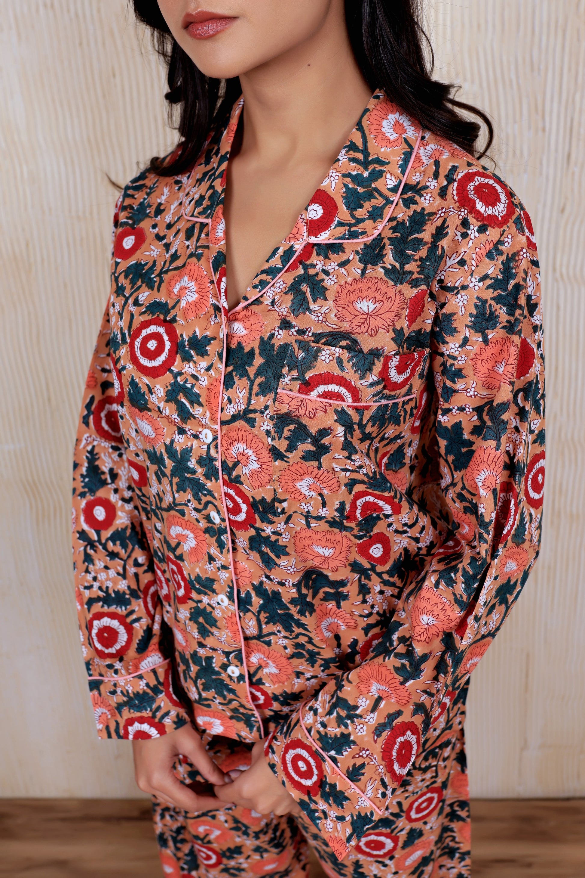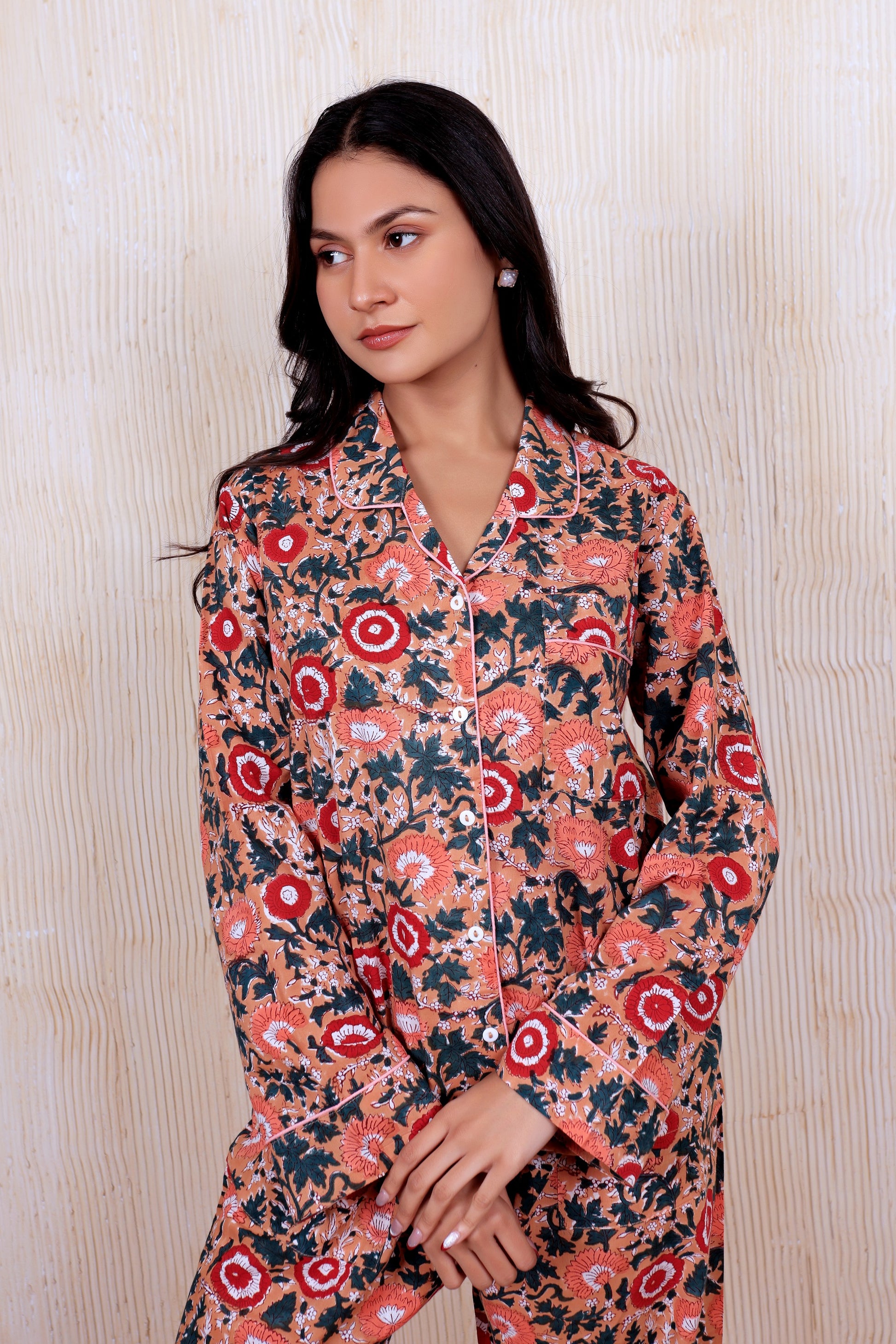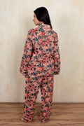 Crafted from premium, breathable cotton, this co-Ord features a long-sleeved button-down top and matching wide-leg pants, both adorned with a captivating floral print inspired by nature's rich tapestry. The warm, e