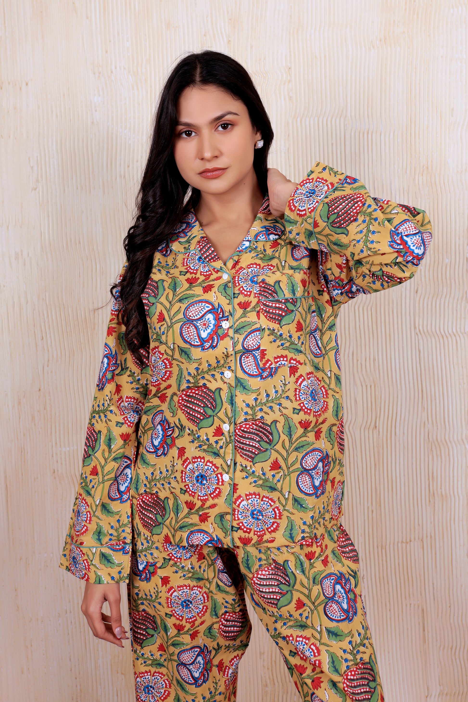 Experience the luxury of handcrafted sleepwear with this artisanal pajama set, featuring authentic hand block printing techniques passed down through generations of Indian craftsmen. The soft cotton construction provides exceptional breathability and comfort, allowing your skin to rest naturally throughout the night. Each piece showcases the Yellow Garden pattern—a testament to meticulous attention to detail and traditional textile artistry. Perfect for those who value sustainable fashion and appreciate the subtle variations that make handmade garments truly unique. Elevate your sleep routine with ethically crafted comfort.