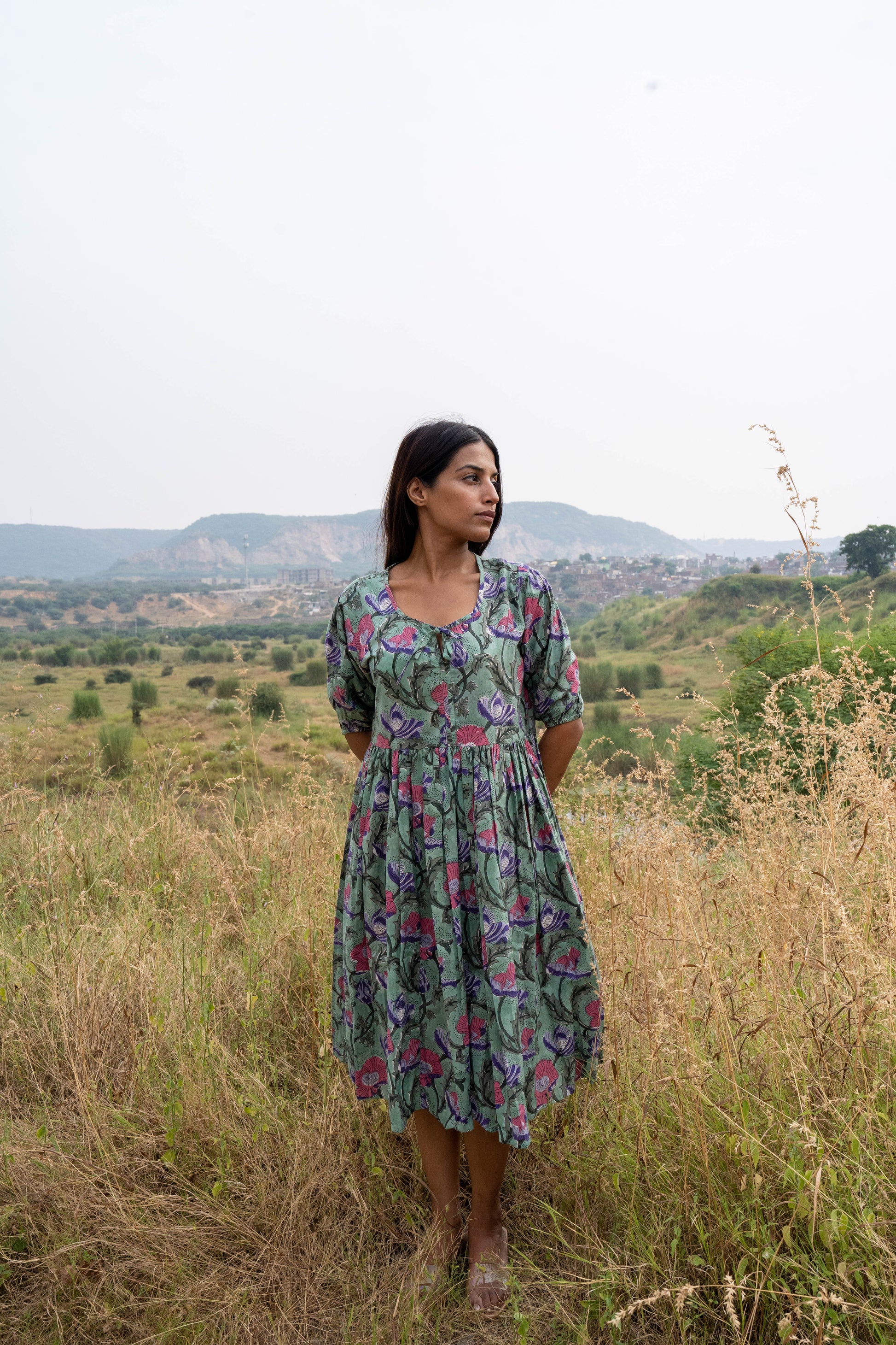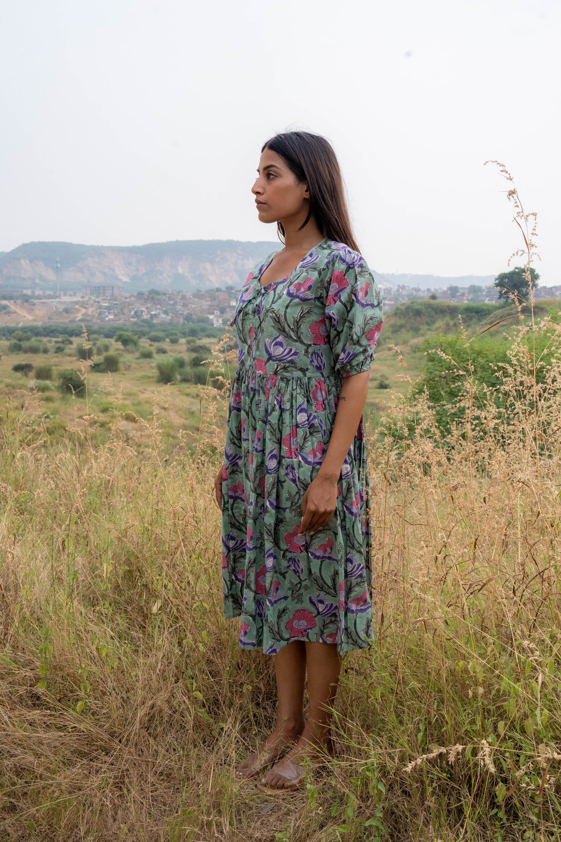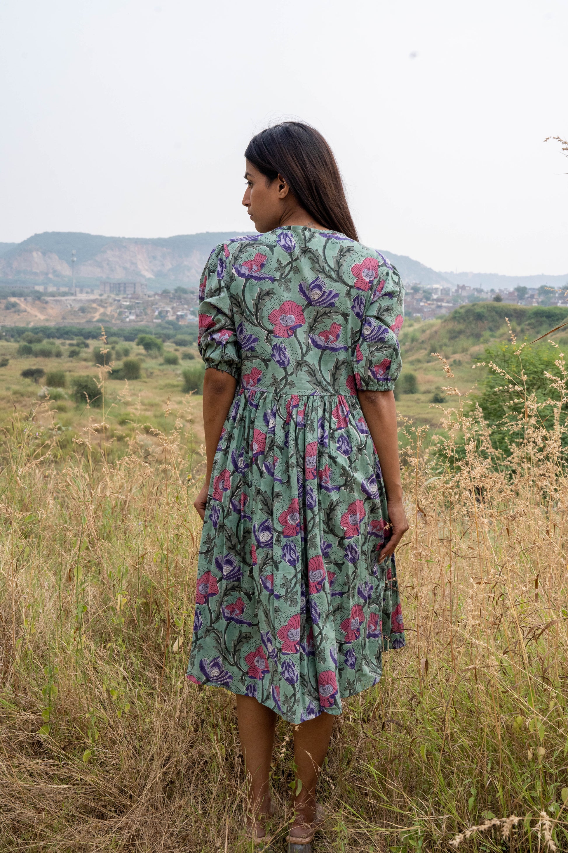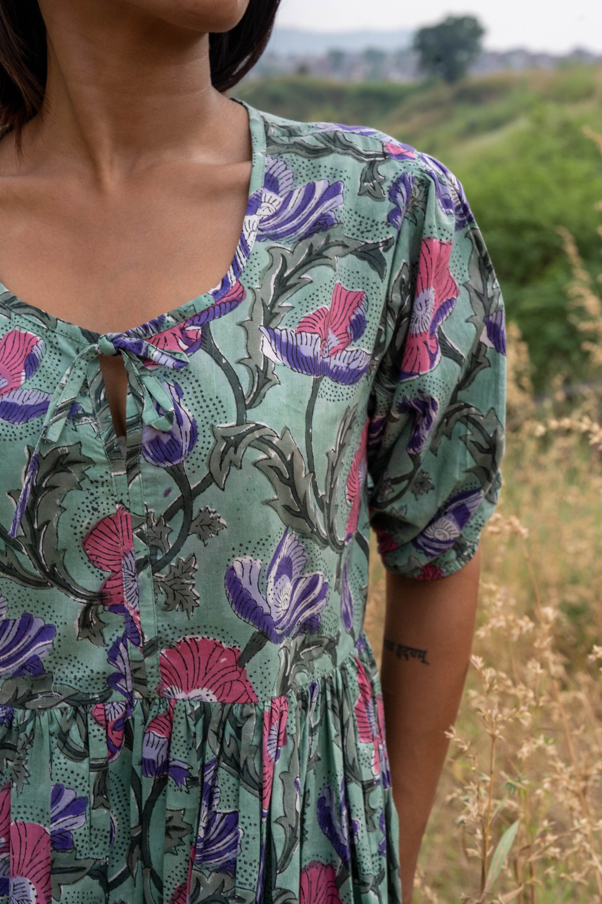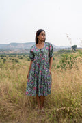 A sense of natural serenity with our Fern Flora Midi Dress. Crafted from premium, breathable cotton, this midi dress features a delicate floral print in soft green and pink hues, reminiscent of a blooming meadow. The gathered skirt and defined waist create a flattering silhouette, while the three-quarter sleeves offer a touch of elegance.