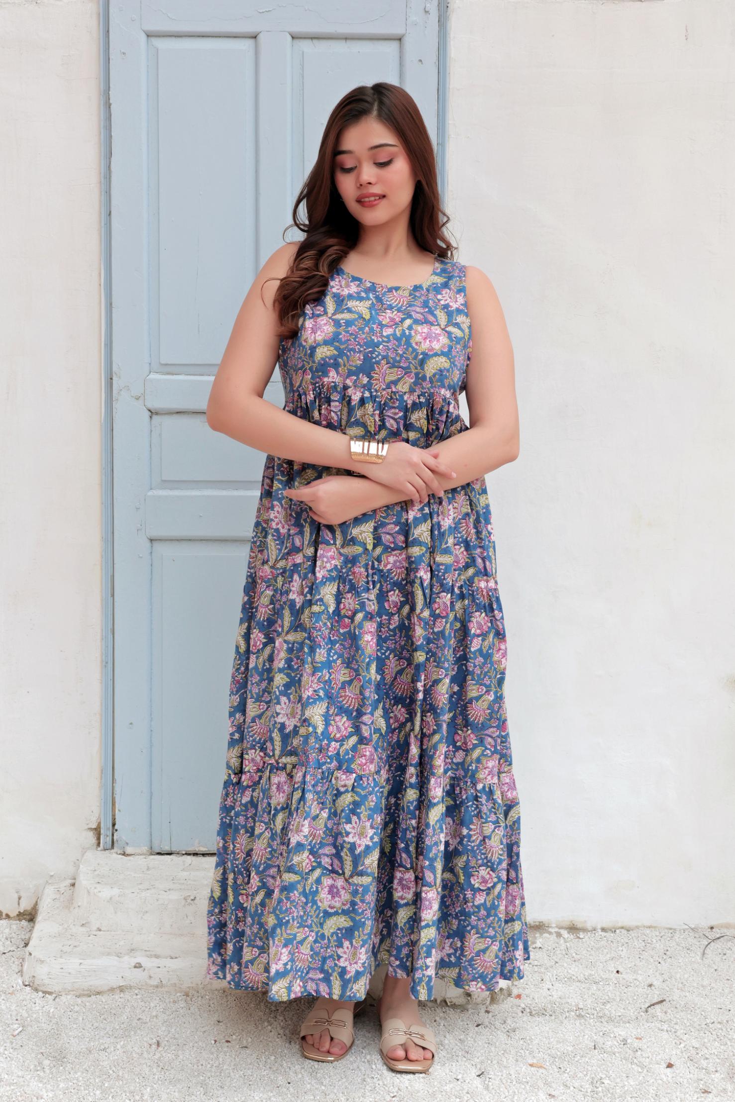 Blue Clara Cotton Maxi Dress combines traditional Indian block print artistry with contemporary comfort. Crafted from breathable cotton, this relaxed-fit maxi features authentic handmade block print detailing that celebrates artisanal craftsmanship. The generous silhouette offers effortless movement, making it ideal for casual wear. Each piece reflects the unique character of hand-printed textiles, ensuring no two dresses are identical. Perfect for those who appreciate quality fabrics and culturally-rooted design.