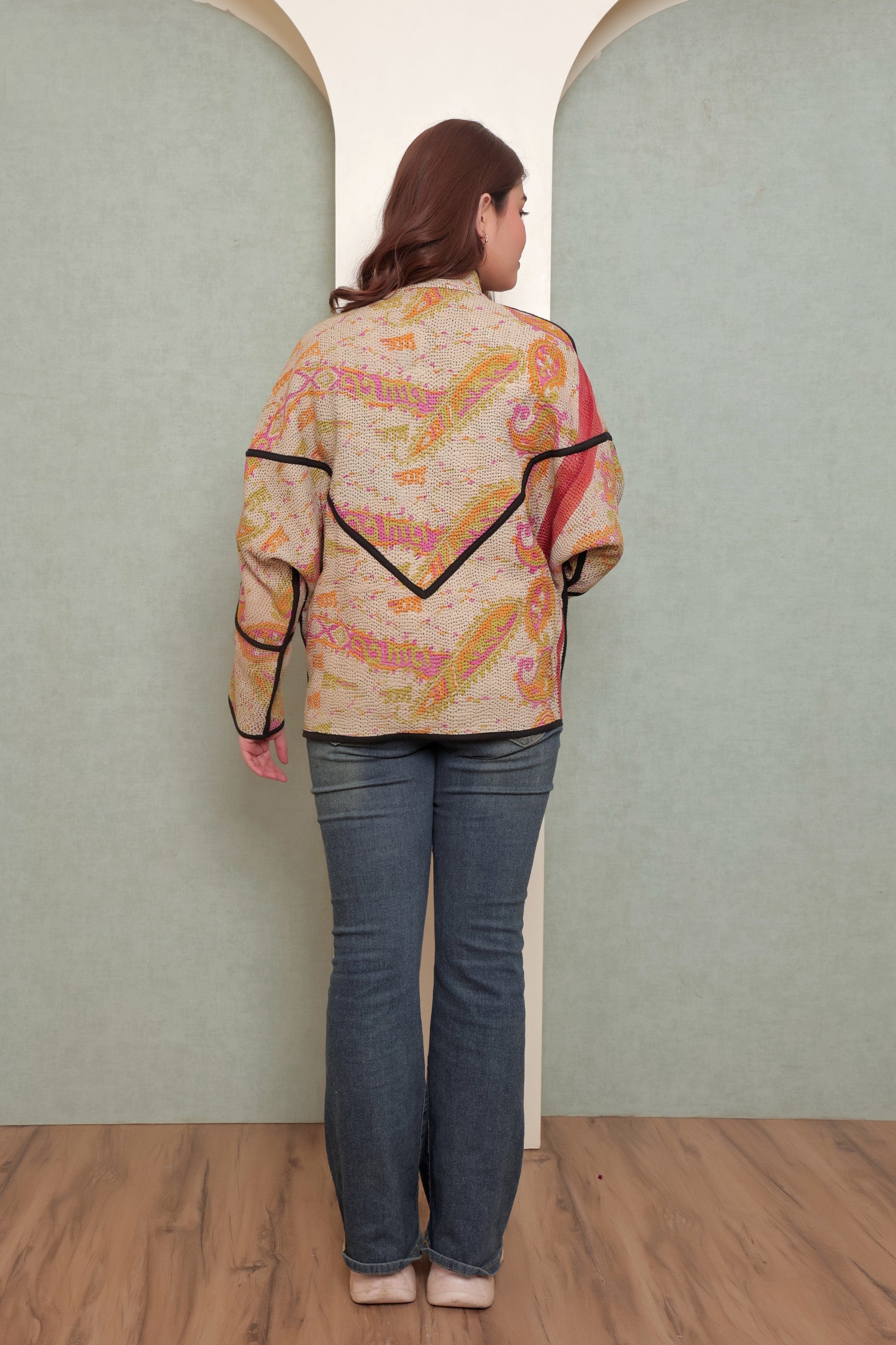 Crafted from repurposed cotton, this vintage-inspired kantha jacket represents sustainable fashion at its finest. Each piece is handmade by skilled artisans, featuring traditional kantha stitching that creates distinctive texture and visual depth. The one-size-fits-all design offers versatile styling, while the one-of-a-kind nature ensures you own something truly unique. By choosing this jacket, you directly support independent makers and reduce textile waste, making a meaningful impact on both craftsmanship and environmental conservation.