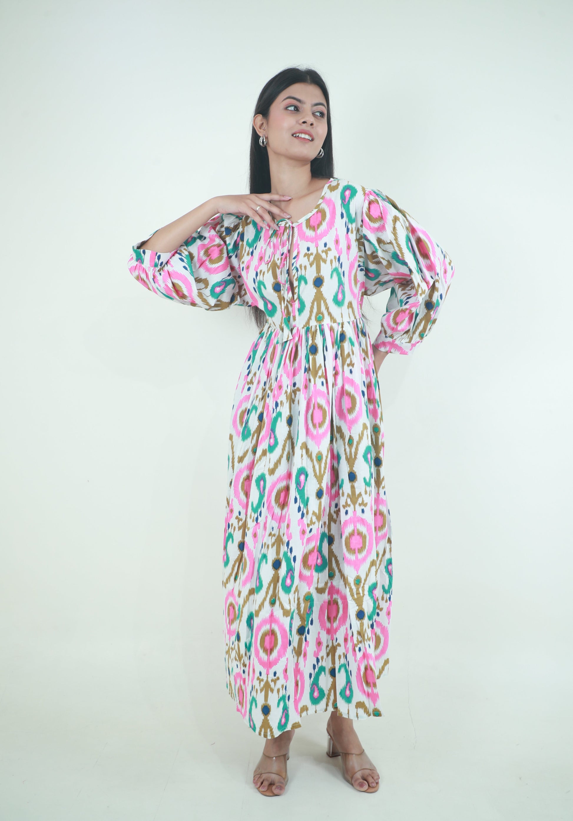 Add a touch of grace and sophistication to your collection with the Blando Cotton Block Print Long Dress. This versatile piece is designed to make you look and feel fabulous, no matter the occasion.
