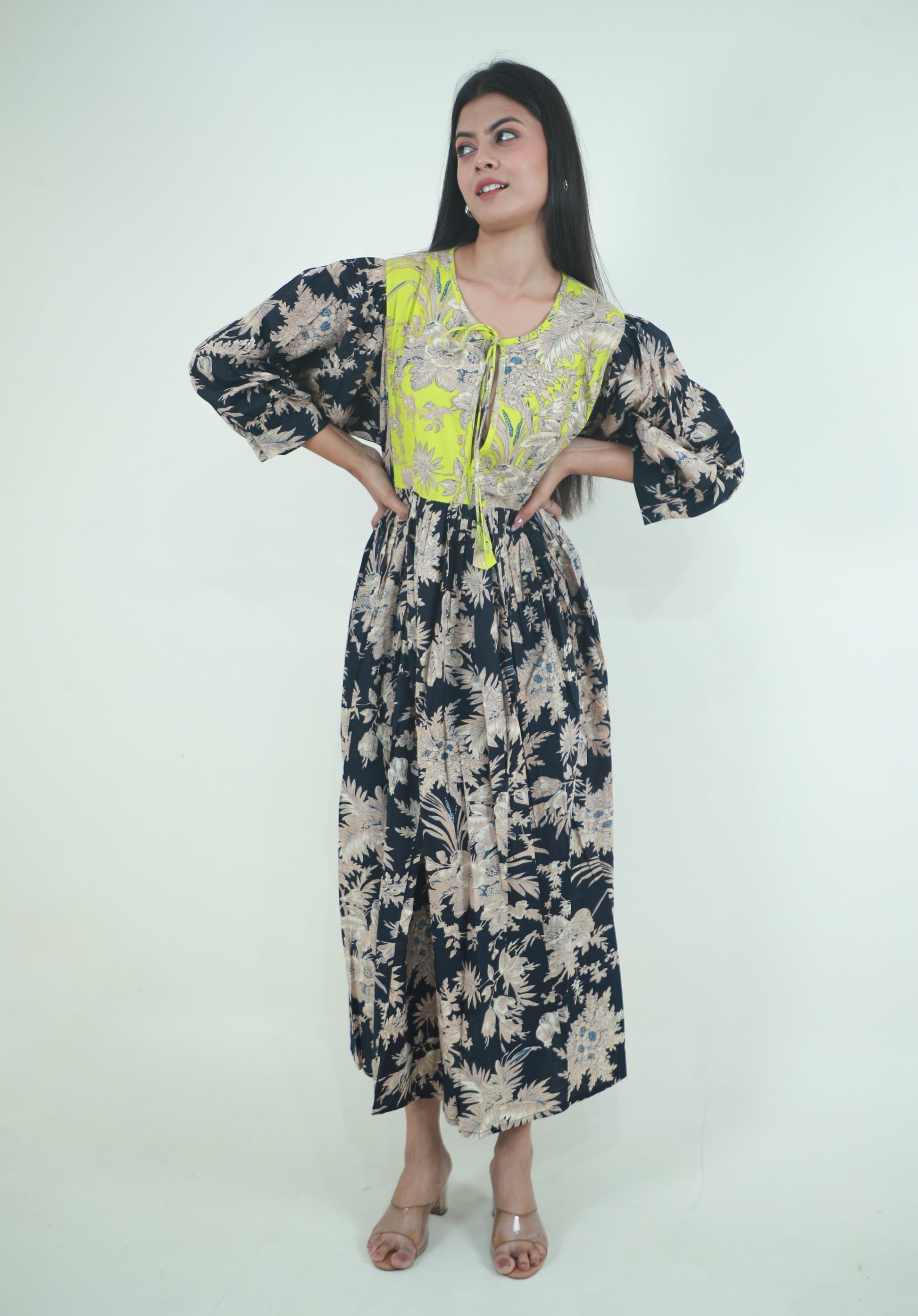 Elevate your wardrobe with the Blando Cotton Block Print Long Dress, a perfect blend of comfort and elegance. This stunning dress is crafted from soft, breathable cotton and features an intricate block print design. The long, flowing silhouette and gathered details create a flattering and feminine look, making it ideal for any occasion, from casual outings to special events.