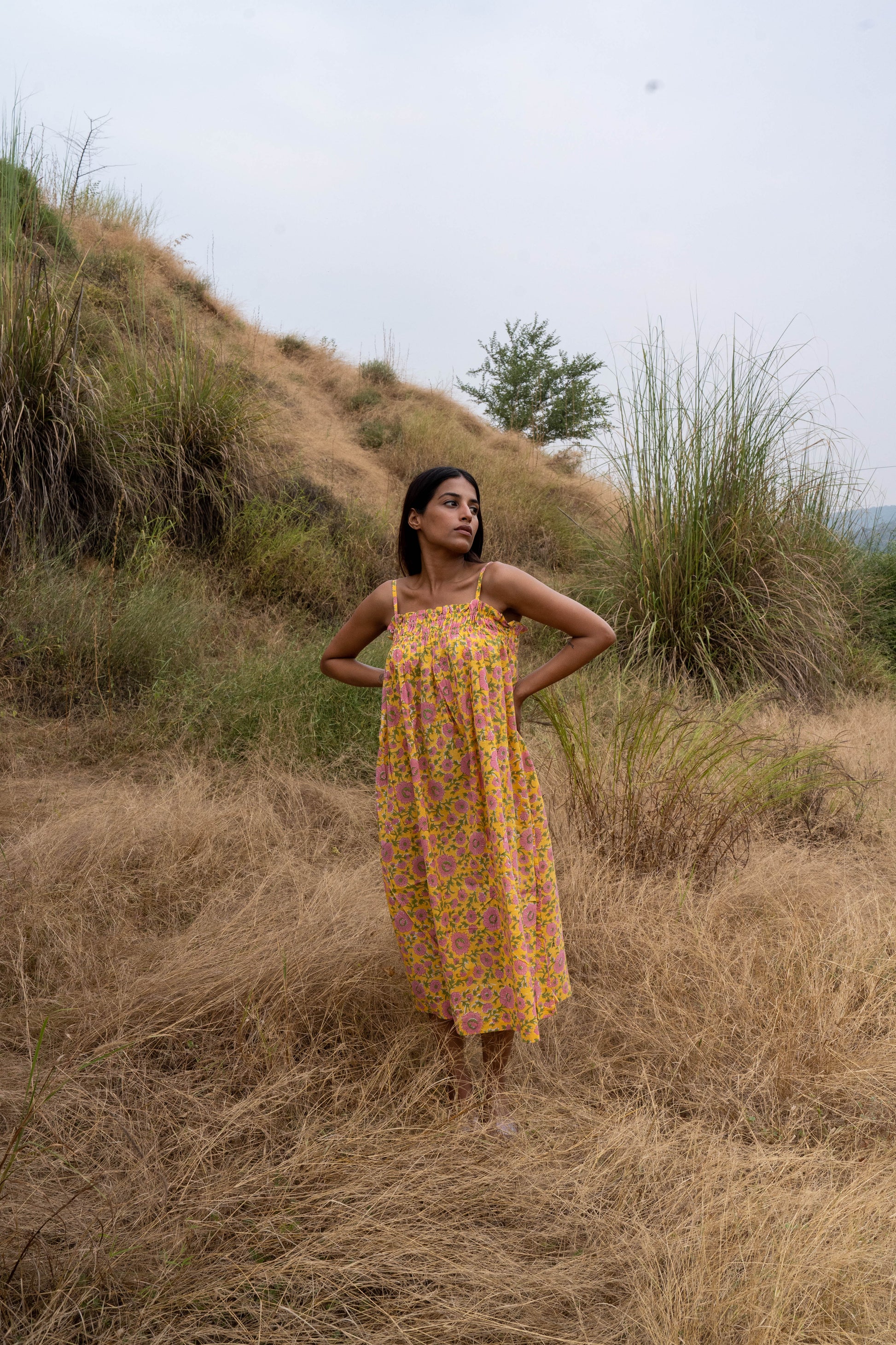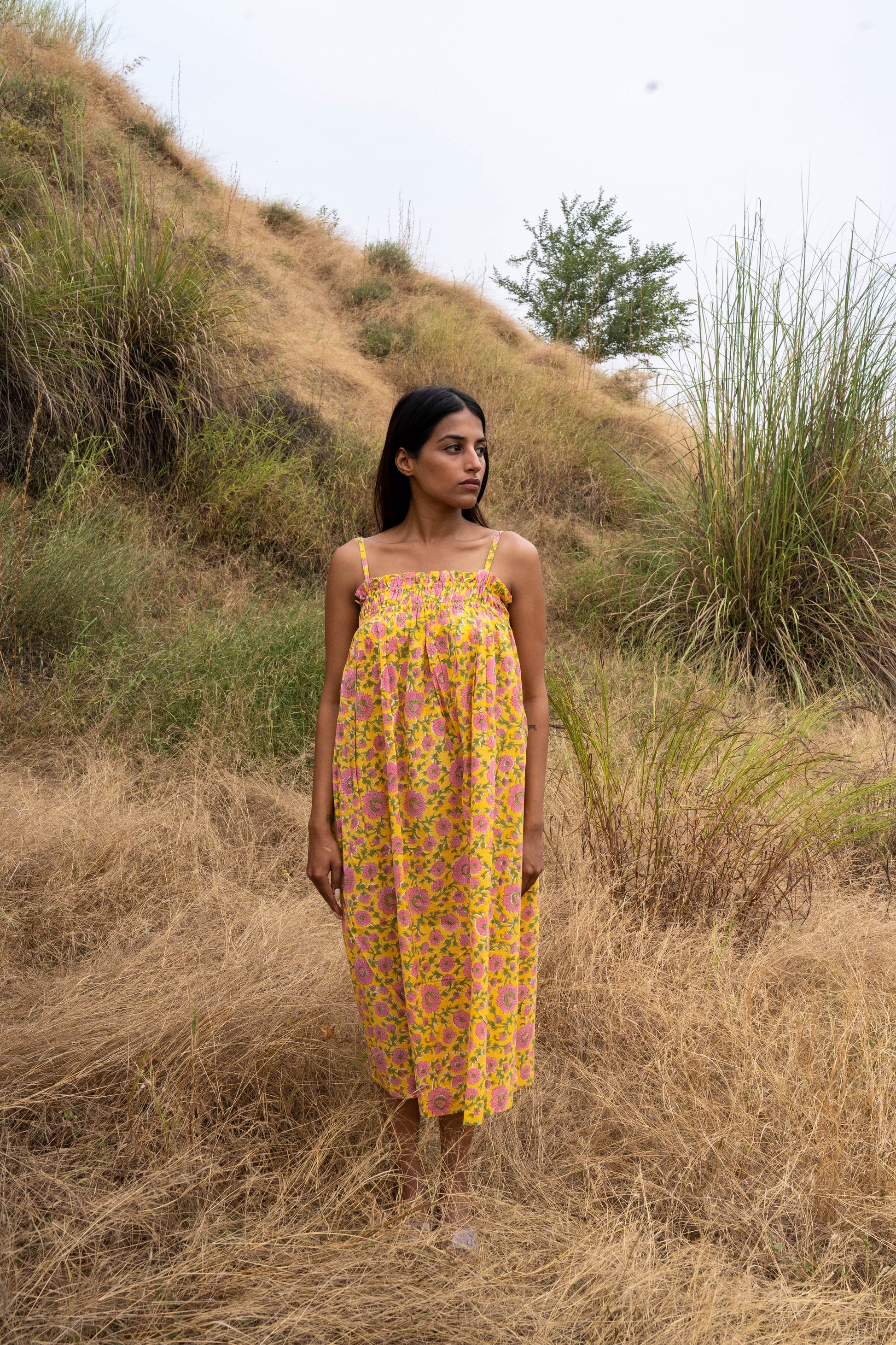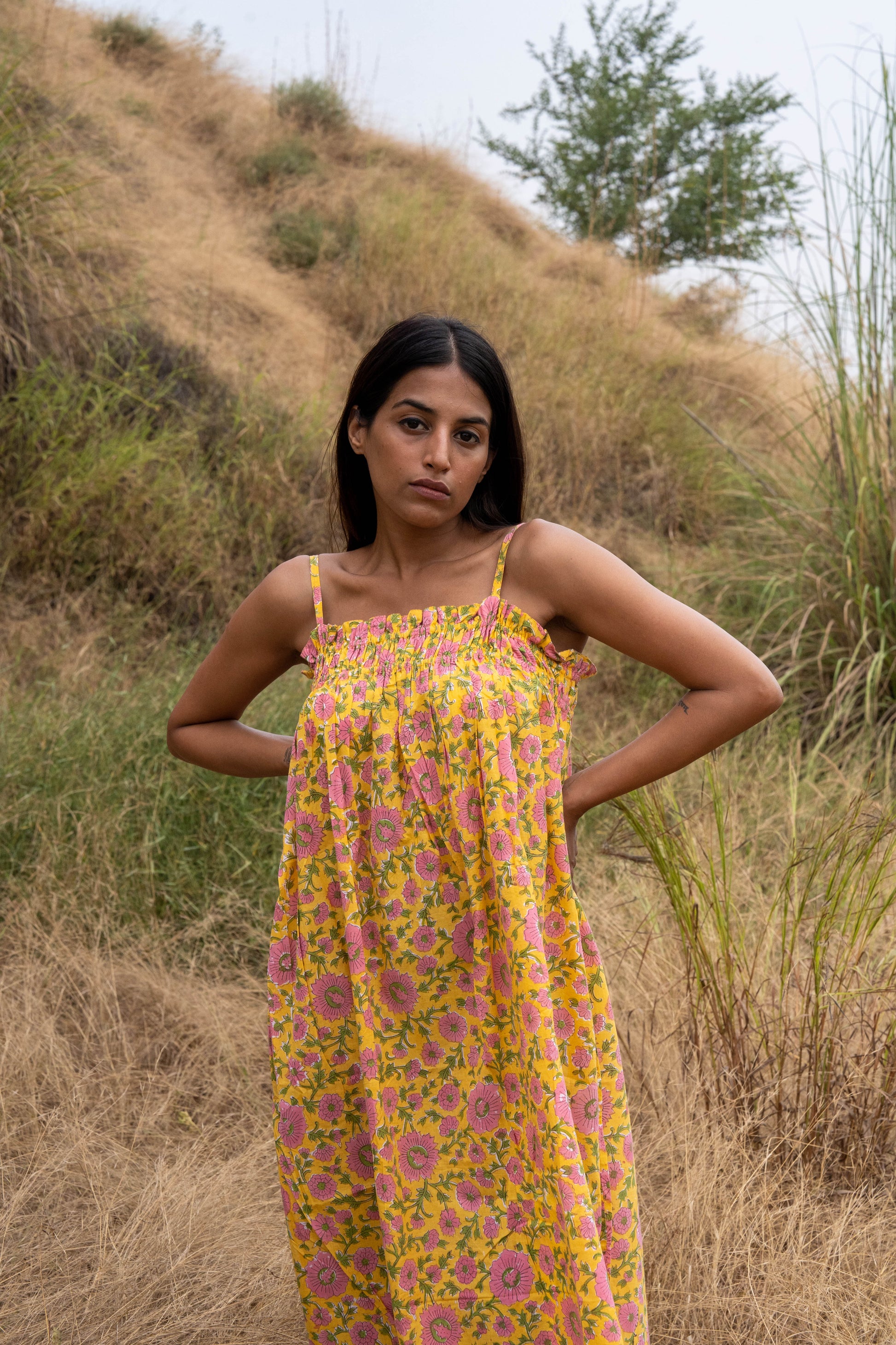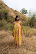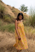 The Meadow Bloom Dress is a vision of summery beauty, crafted from soft, breathable cotton in a cheerful shade of yellow. The dress is adorned with a delightful print of pink flowers and vibrant green leaves, evoking the charm of a sun-drenched meadow. The thin, delicate straps and relaxed fit create a feeling of effortless elegance, while the breezy fabric ensures comfort on even the warmest days. This dress is a perfect choice for embracing the spirit of summer with its cheerful colors and delightful floral print.