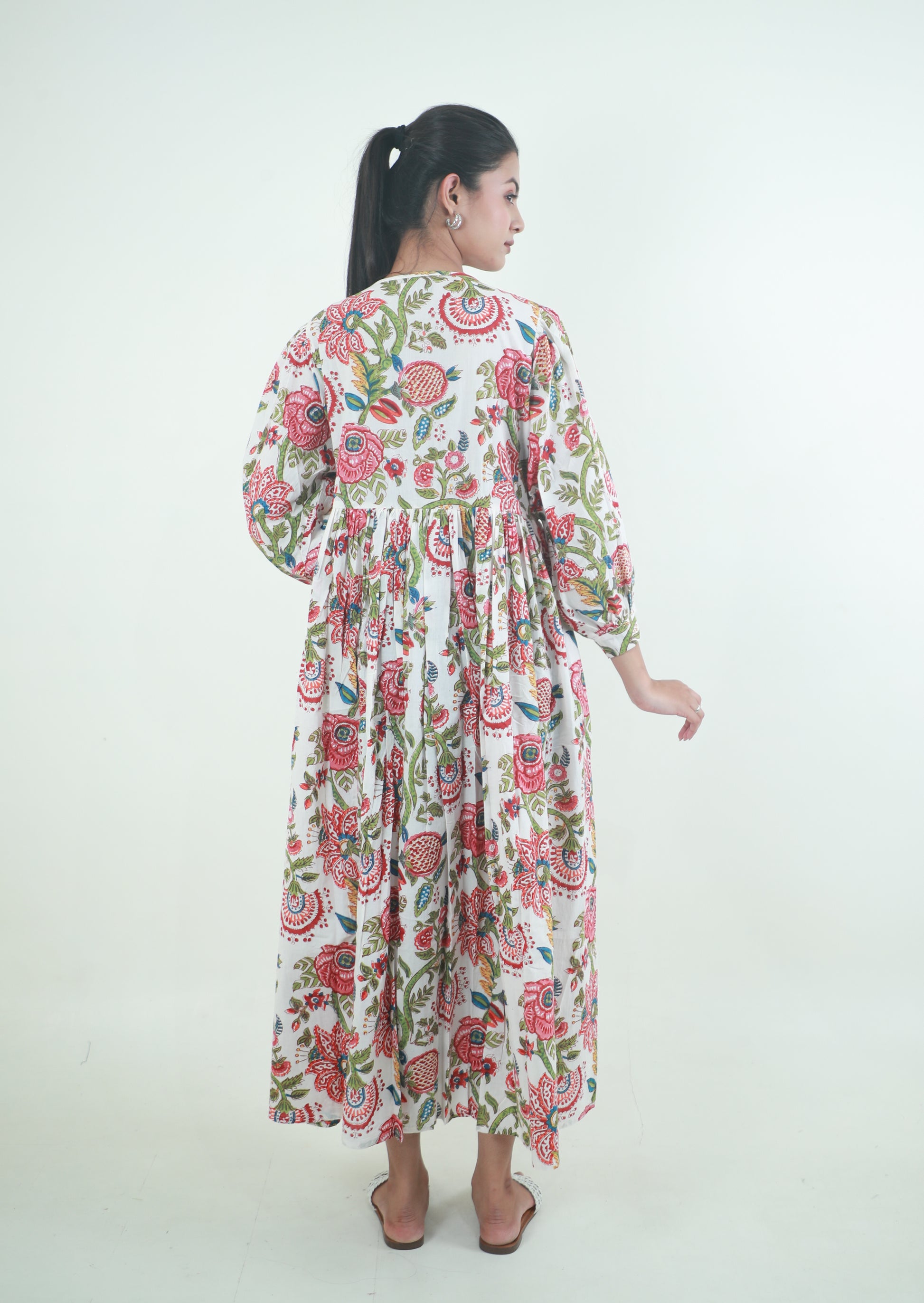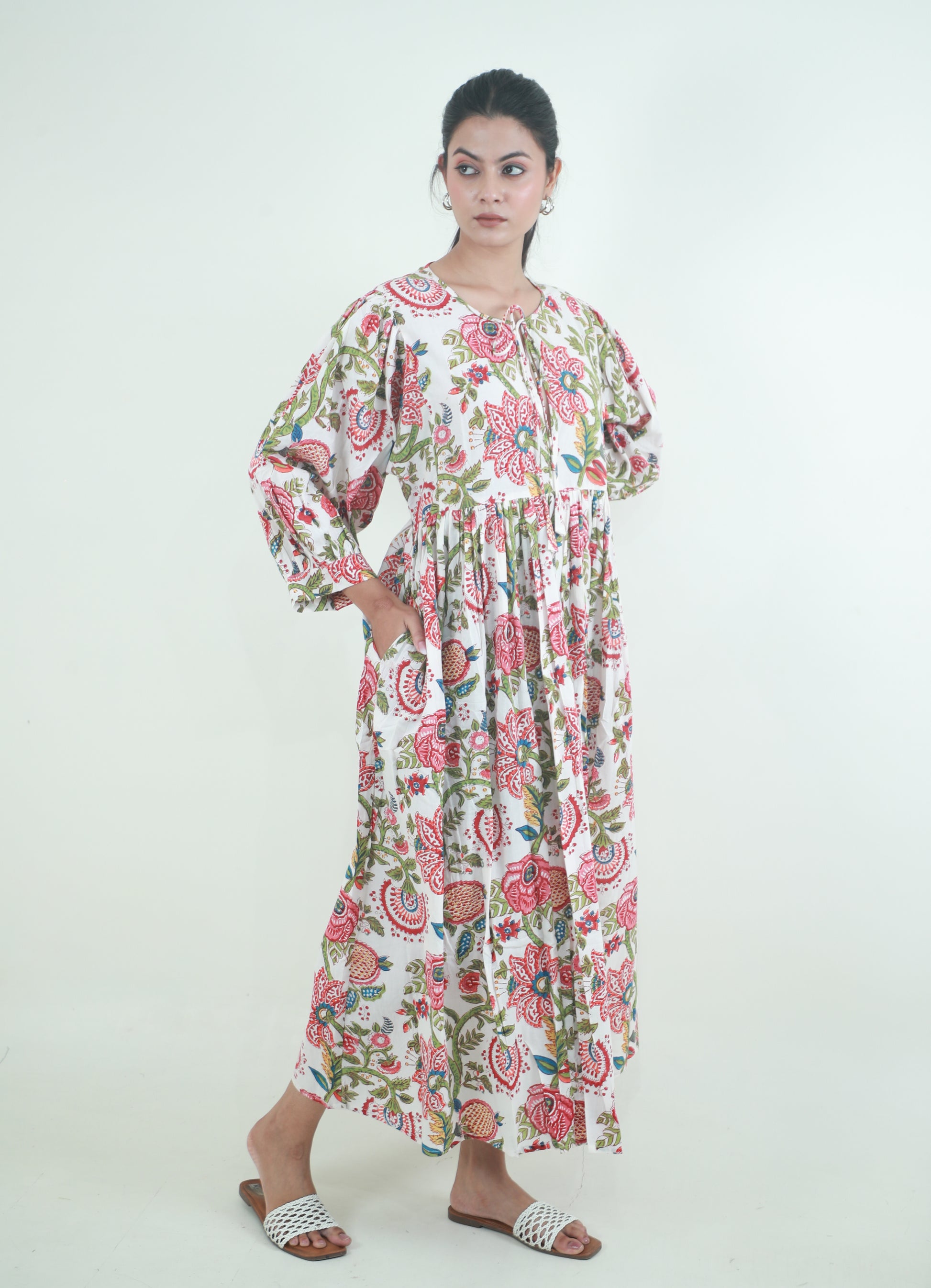 Elevate your wardrobe with the Blando Cotton Block Print Long Dress, a perfect blend of comfort and elegance. This stunning dress is crafted from soft, breathable cotton and features an intricate block print design. The long, flowing silhouette and gathered details create a flattering and feminine look, making it ideal for any occasion, from casual outings to special events.