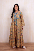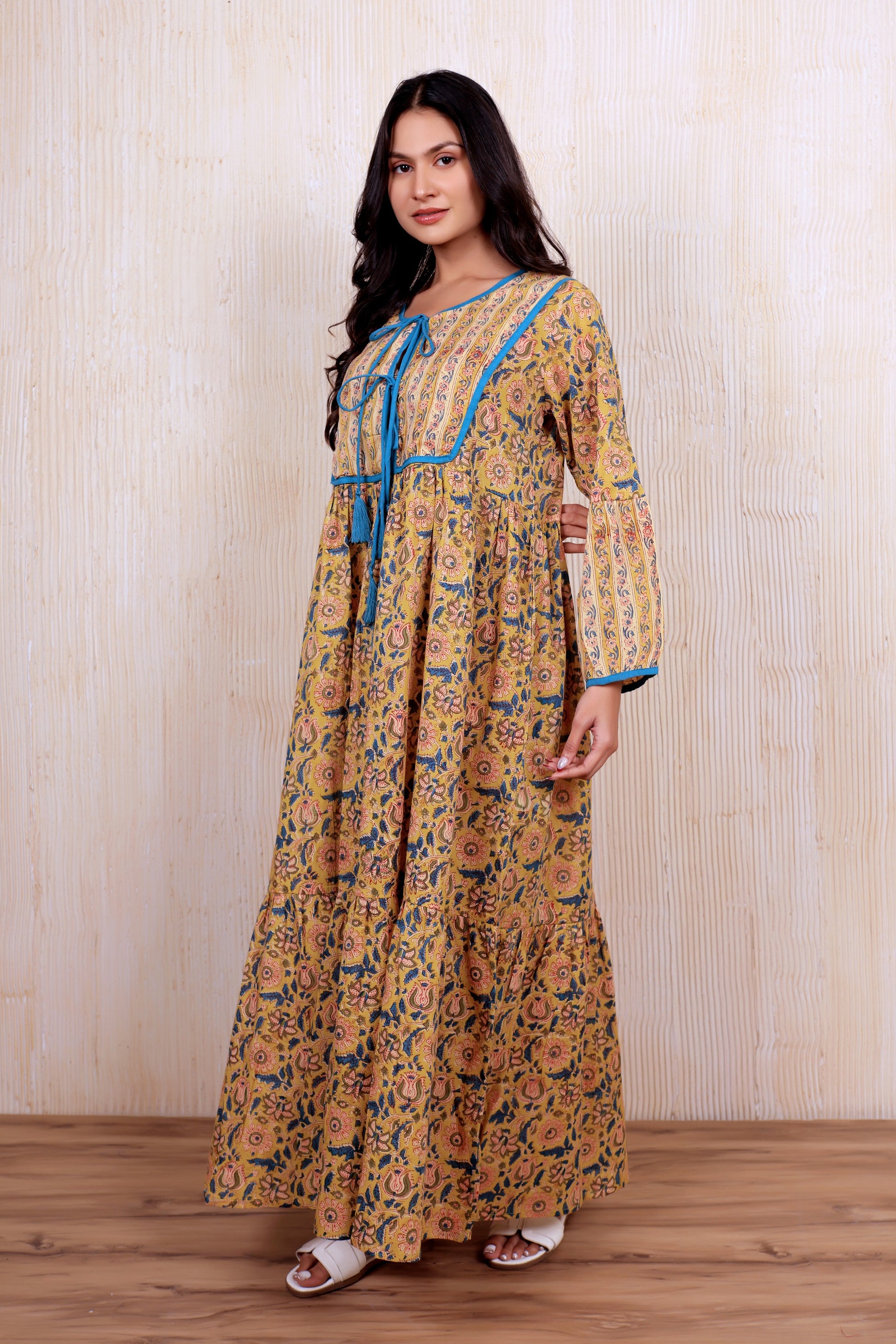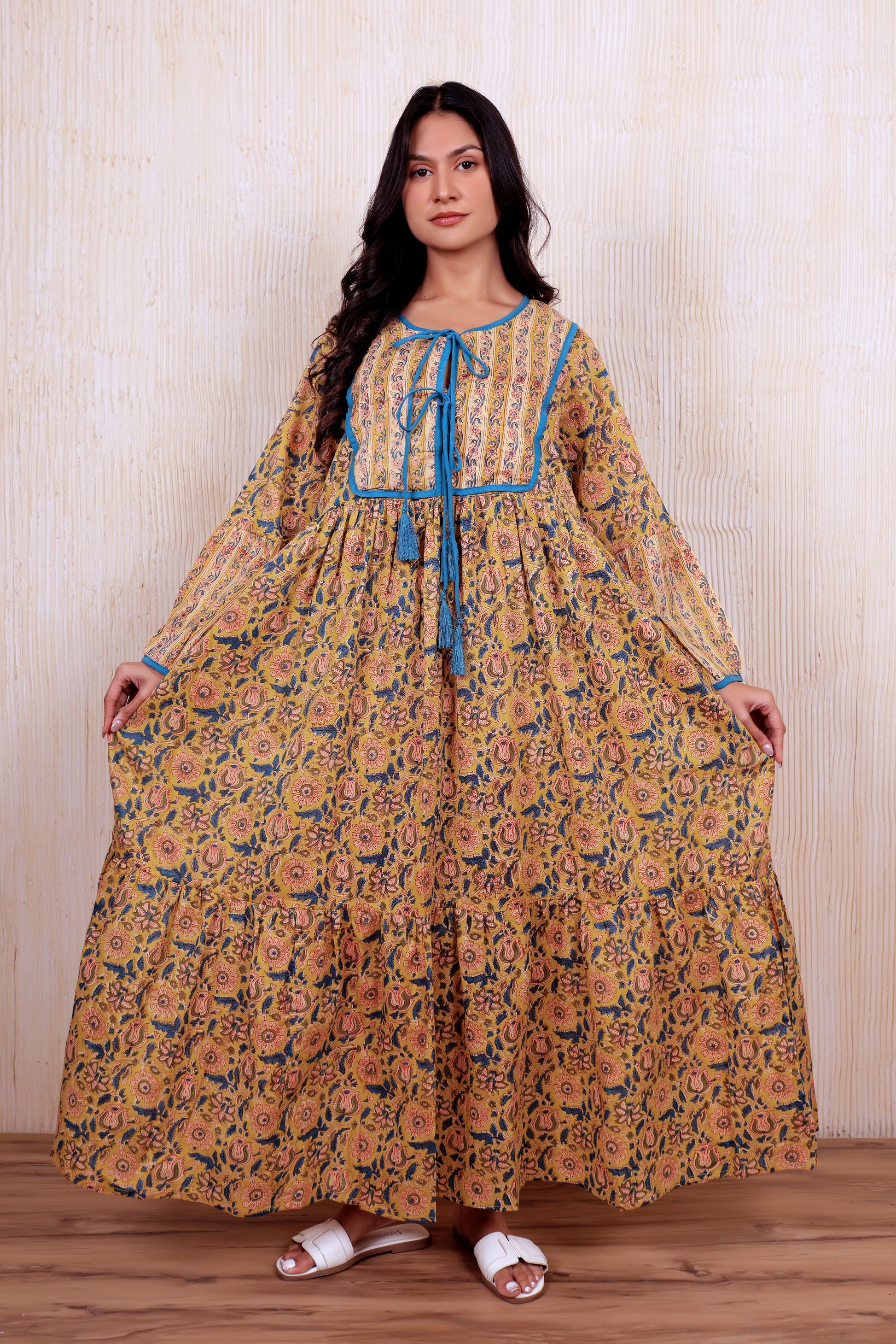 Crafted from sustainably sourced cotton, this block-printed maxi dress embodies traditional artisanal techniques passed down through generations. The flowing silhouette and breathable fabric make it an ideal choice for warm weather, while the timeless indigo palette ensures versatility across seasons. Each piece carries the distinctive character of hand-printed patterns, making it a unique addition to any wardrobe. Perfect for those seeking ethical fashion that celebrates heritage craftsmanship without compromising on contemporary style.