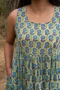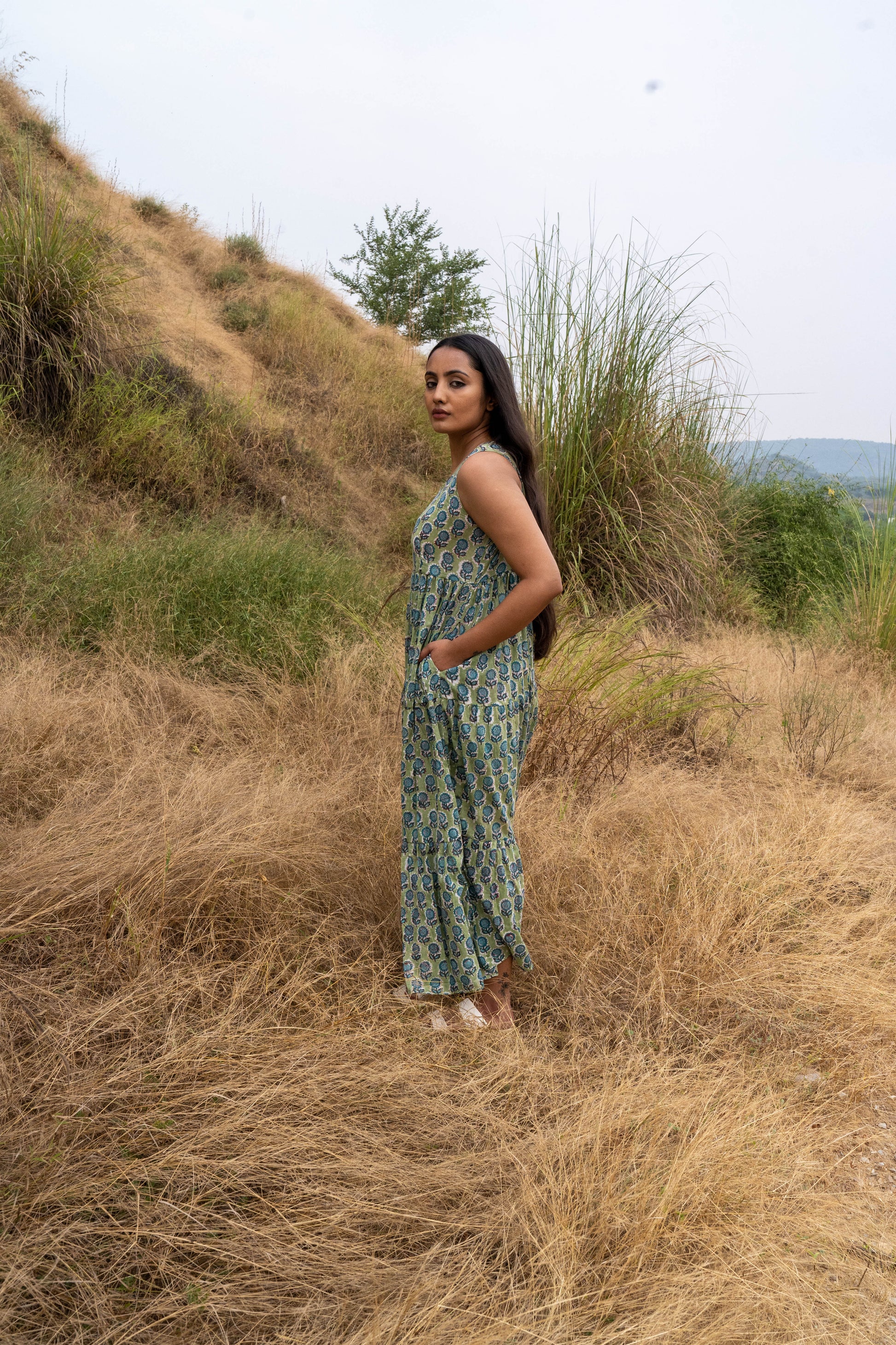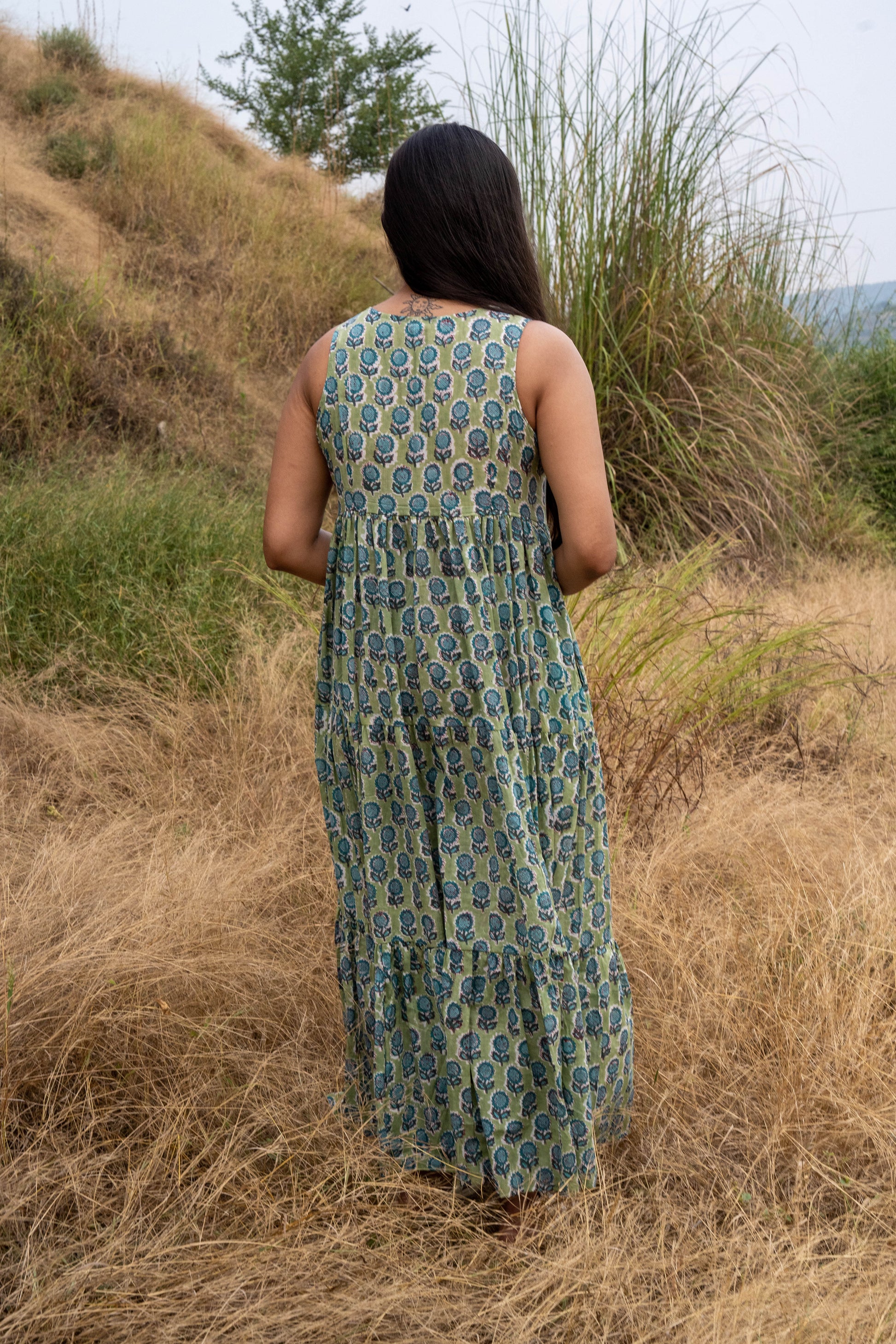 This maxi dress features a delicate floral print in soft green and blue hues, reminiscent of a peaceful meadow. The flowing silhouette and gentle gathers create a look that's both feminine and comfortable, perfect for warm days and relaxed occasions.