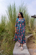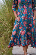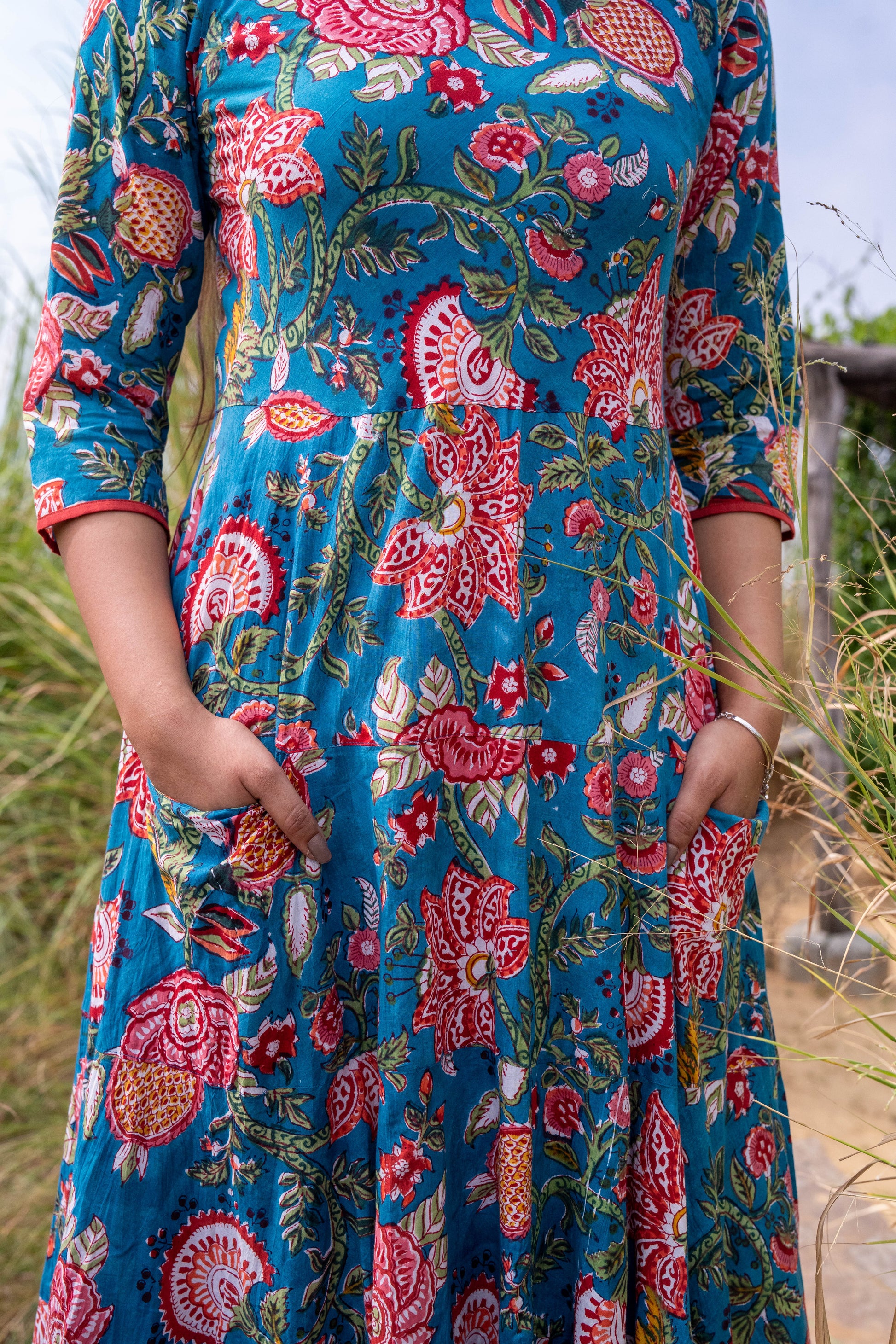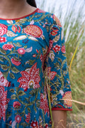 The Midnight Blue Dress is a vision of summery elegance, crafted from soft, breathable cotton in a deep, rich shade of blue. The dress is adorned with a delightful print of red flowers and vibrant green leaves, reminiscent of a blooming garden under a starry sky. The 3/4 sleeves and relaxed fit create a feeling of effortless grace, while the breezy fabric ensures comfort on even the warmest nights. This dress is the perfect choice for embracing the spirit of summer with its cheerful colors and delightful floral print.