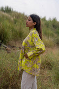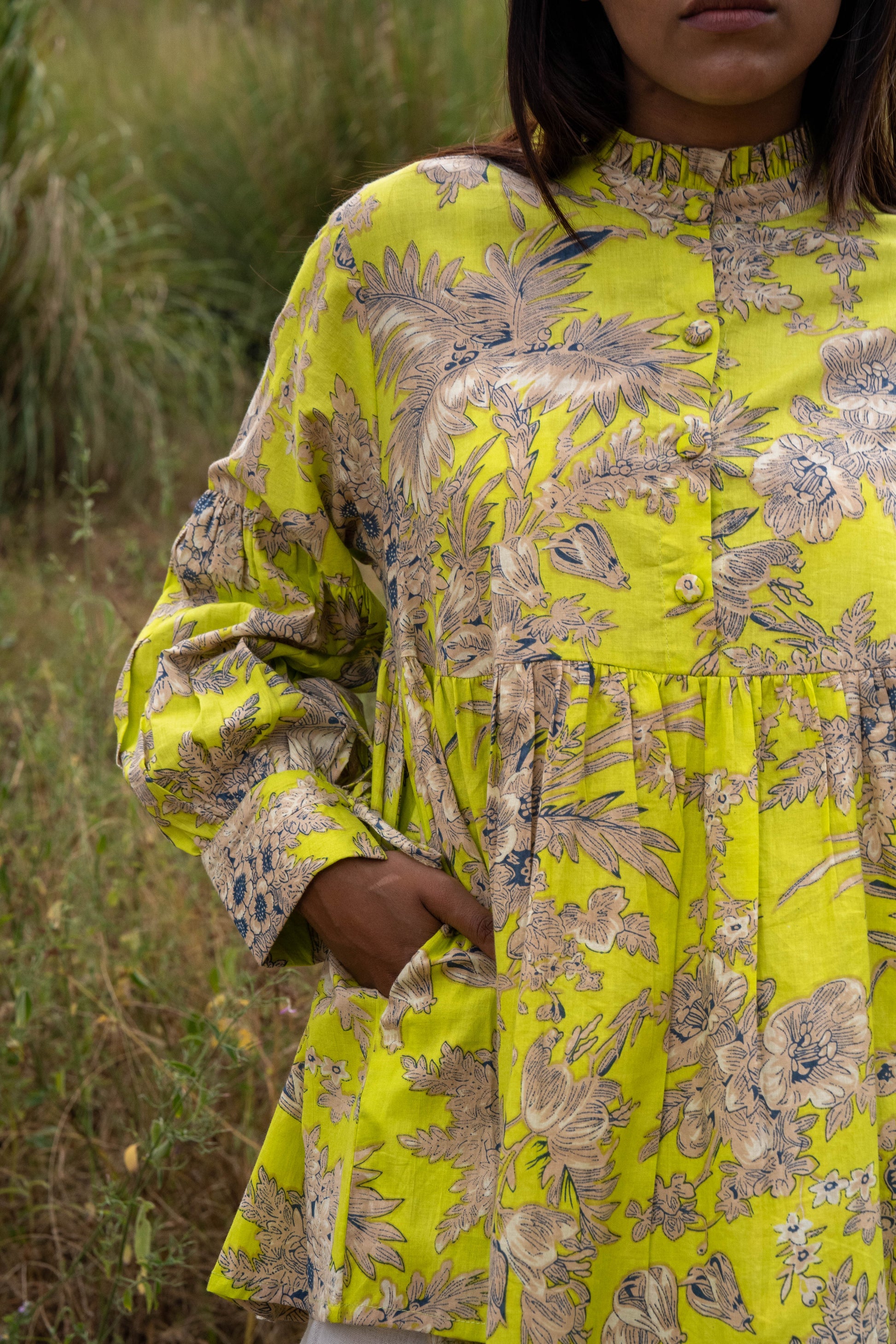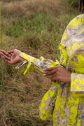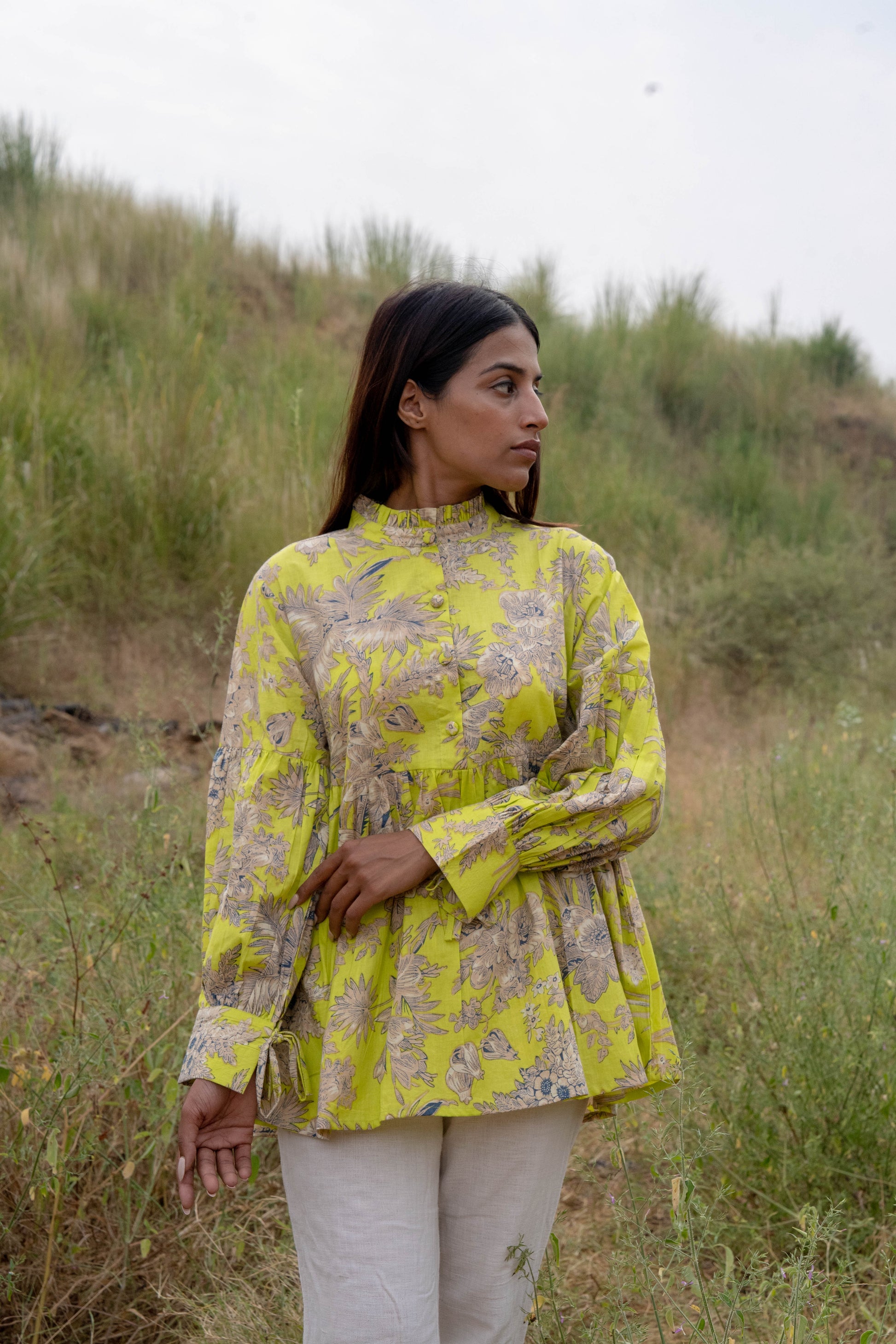 This top features a unique print in a refreshing lime hue, reminiscent of sunlit meadows. The gathered neckline and voluminous sleeves create a flattering silhouette, while the tie detailing on the cuffs adds a touch of sophistication.