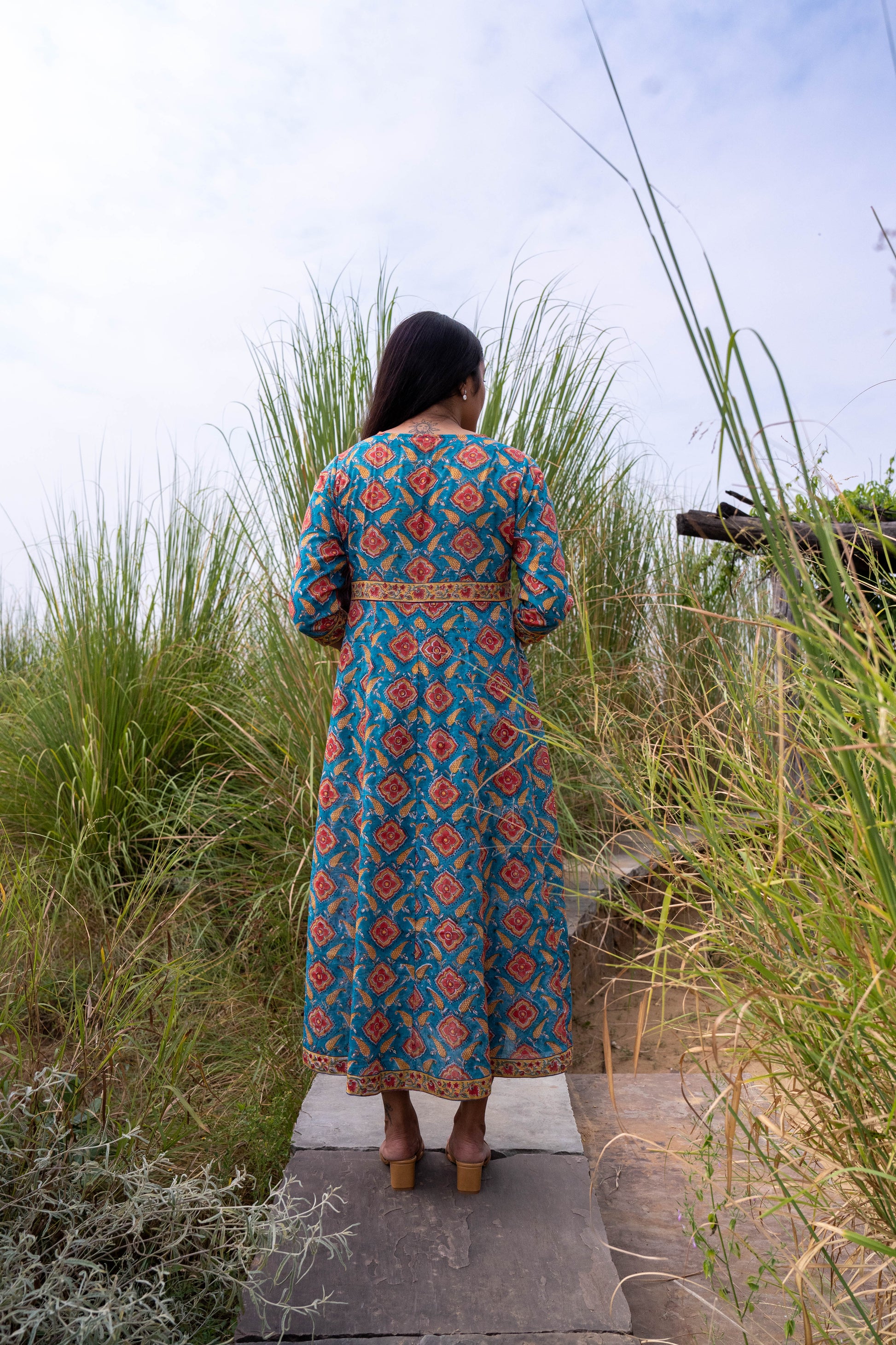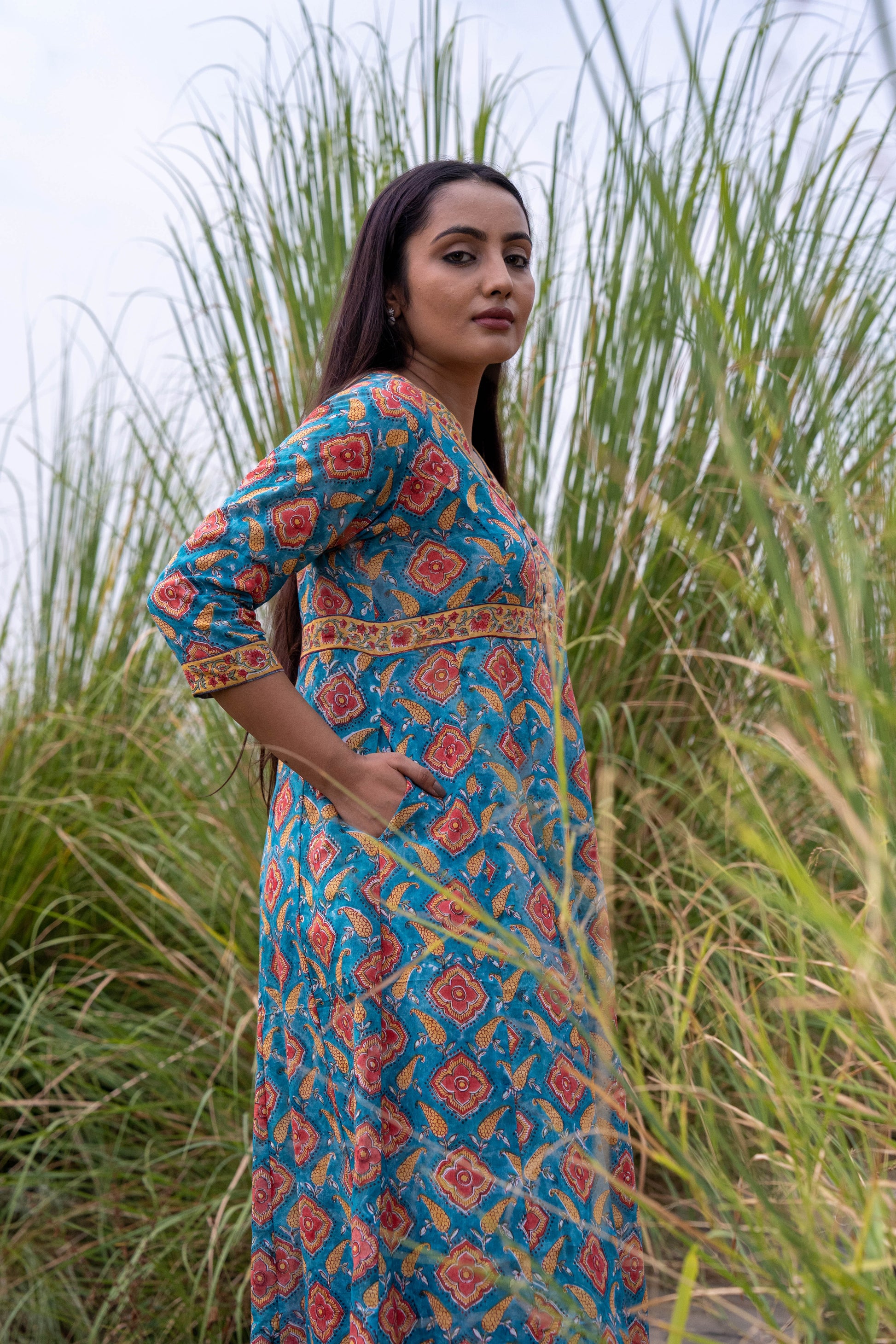 The Shalimar Garden Dress is a true testament to the beauty and artistry of Mughal India. Crafted from soft, breathable cotton, this dress features a captivating blend of blue and mustard hues, adorned with intricate floral Mughal prints. The 3/4th loose sleeves and relaxed silhouette provide effortless comfort, while the handy pockets add a touch of practicality. Inspired by the serenity of the Shalimar Gardens, this dress is a timeless piece that exudes elegance and sophistication.