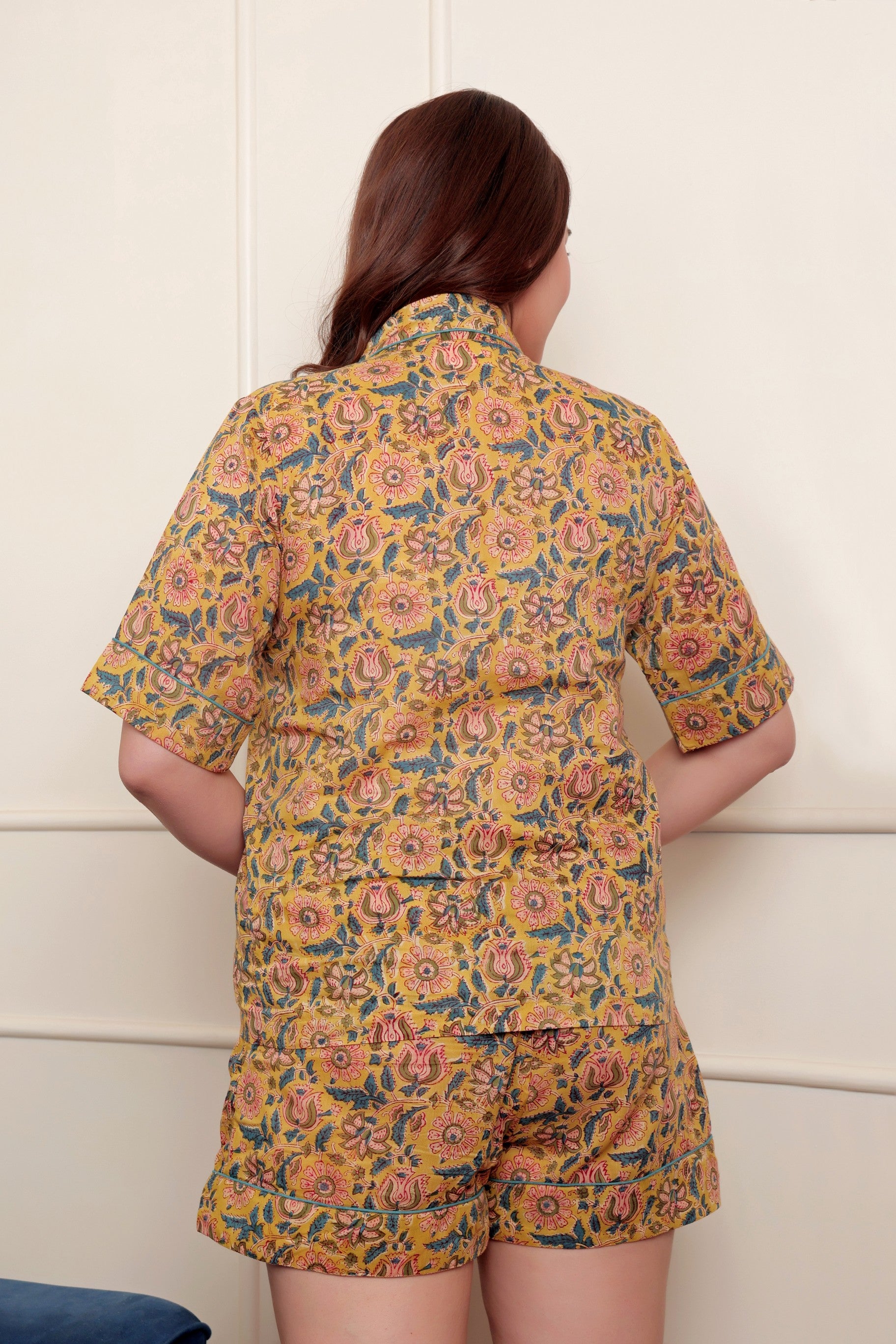 Experience the luxury of handcrafted sleepwear with this artisanal Short pajama set, featuring authentic hand block printing techniques passed down through generations of Indian craftsmen. The soft cotton construction provides exceptional breathability and comfort, allowing your skin to rest naturally throughout the night. Each piece showcases the Yellow Garden pattern—a testament to meticulous attention to detail and traditional textile artistry. Perfect for those who value sustainable fashion and appreciate the subtle variations that make handmade garments truly unique. Elevate your sleep routine with ethically crafted comfort.
