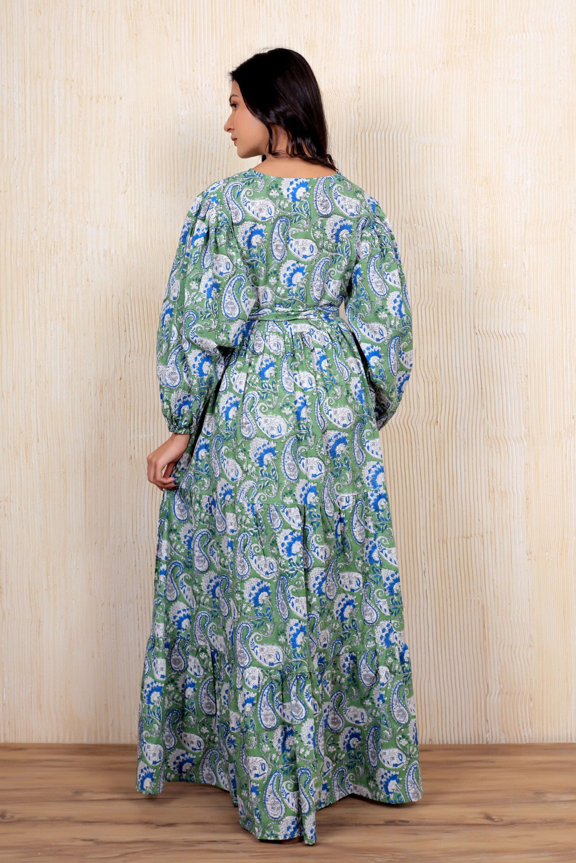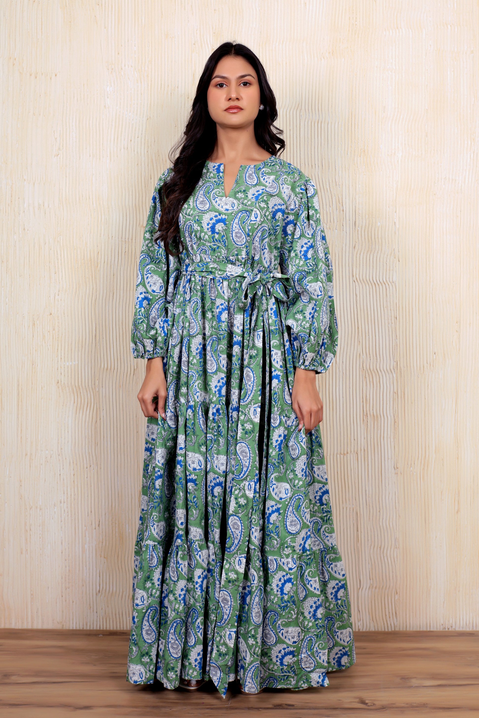 Crafted from sustainably sourced cotton, this block-printed maxi dress embodies traditional artisanal techniques passed down through generations. The flowing silhouette and breathable fabric make it an ideal choice for warm weather, while the timeless indigo palette ensures versatility across seasons. Each piece carries the distinctive character of hand-printed patterns, making it a unique addition to any wardrobe. Perfect for those seeking ethical fashion that celebrates heritage craftsmanship without compromising on contemporary style.